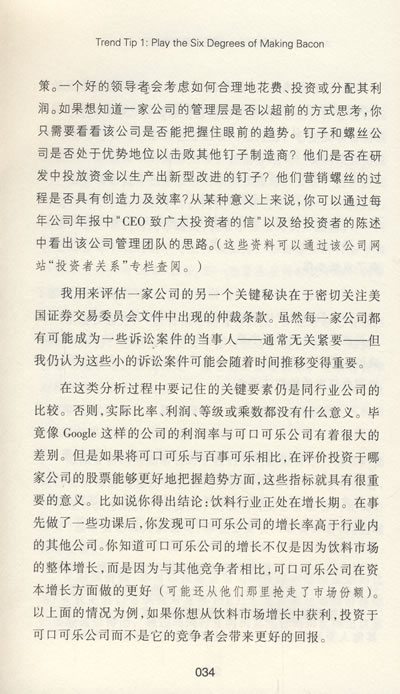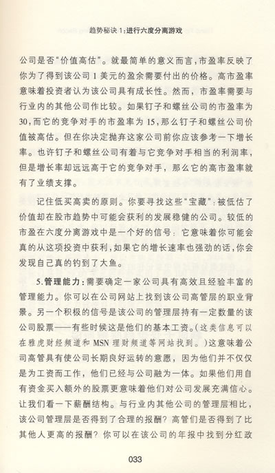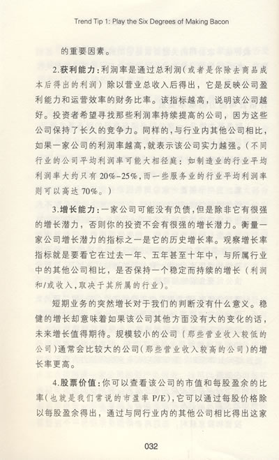 如果你能选择出那些在趋势中处于最佳位置并且成长良好的公司,那么就意味着你能通过六度分离游戏获得很高的收益。比如说,在住宅建造热潮中,钉子的需求量很大,所以钉子和螺丝公司(Nails and Screws,Inc.,一家制造钉子和螺丝的公司),是一个很好的投资方向。但是不要把资金投向随便一个与六度趋势相连的公司。因为一个趋势预示着很好的投资机会,但却并不意味着相关的某家公司就一定能从这个趋势中获利。