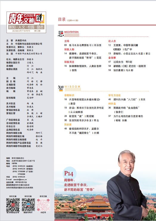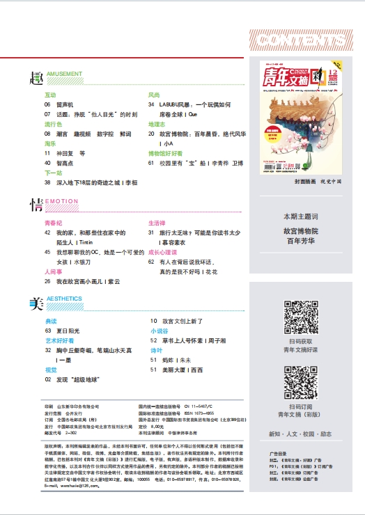 今年是故宫博物院建院100周年,本期杂志出刊时,幸福的暑假就要开始啦!这可是大家四方游历、增长学识与见闻的大好时机,因此,本期杂志策划了“故宫博物院百年芳华”专题,以饱满的内容增进读者对故宫的了解,唤醒人们对世界的好奇。在这一专题中,有著名历史学家阎崇年亲口讲述他与故宫的人生情缘,有年轻的故宫工作人员为故宫画小画儿的动人故事,有以“故宫十二时辰”为逻辑串联起的故宫美景图文,有体现故宫现代环保理念的深度报道,还有介绍故宫趣味知识的科普文章,如《六百年的故宫从未被水淹过?》《辟谣!那些关于故宫的灵异传说》等。为了给读者朋友们营造亲切的阅读氛围,我们的美编也运用智慧,发挥巧思,做了精妙的设计,让专题最终呈现的效果,既轻盈、通透、活泼、亲和,又不失故宫庄严之美。所以,还等什么呢?赶快一手拿着杂志,一边去故宫打卡,过一个美美的暑假吧!